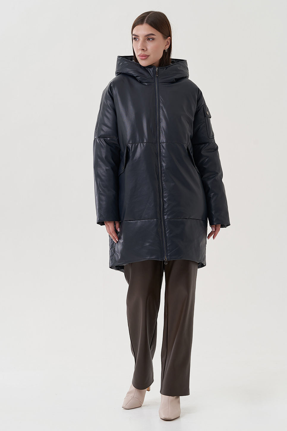Женский пуховик из эко кожи коричневого цвета