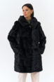 Шуба из меха норки черного цвета. Изделие средней длины, но его можно укоротить, как и рукава. Застегивается с помощью шубных крючков и пуговицы. Модель прямого фасона и дополнена объемным капюшоном. Раскладка меха - поперечные пластины. Подклад из полиэстера износоустойчив и позволяет носить шубу долгое время. Модель сочетается как с брюками, так и с юбками.